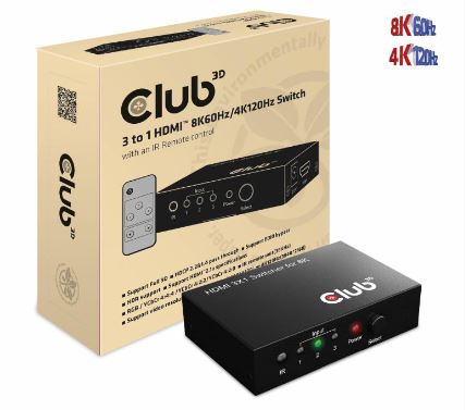 Der Club 3D CSV-1381 ist ein HDMI2.1a. 3 auf 1 Switch, der Ihr High-Definition-Video und digitales Audio von einem der HDMI-Eingänge an einen 8K60Hz/4K120Hz HDMI-Ausgang weiterleitet. Alle Eingänge sind in der Lage, bis zu 8K60Hz/4K120Hz hochauflösende Videoquellen gleichzeitig zu verarbeiten. Das Umschalten der Eingänge kann per Tastendruck, am Gerät selbst oder mit einer IR-Fernbedienung erfolgen, um das Umschalten zu erleichtern. Dies ist ein leistungsstarker und kompakter HDMI 8K-Switcher in einem Metallgehäuse mit einer externen Stromversorgung von 100-240VAC / 5V-1A DC.
