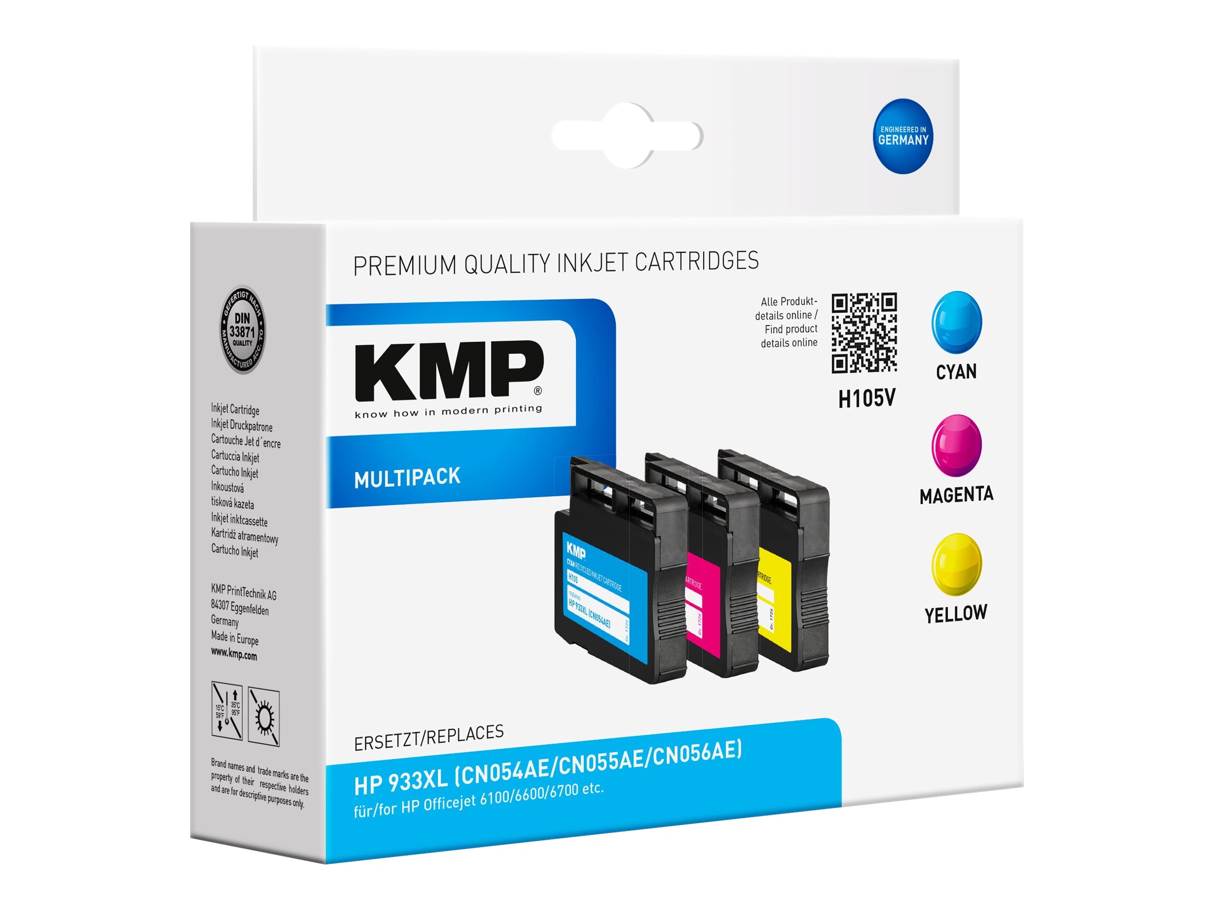 Modellbezeichnung MULTIPACK H105V Stückzahl 3er Kompatible Modelle HP OfficeJet 6100, 6600, 7110, 7610, 6700 Füllvolumen 14 ml Artikelzustand Refill; Kompatibel Typ Tintenpatrone Druckfarbe Cyan; Magenta; Yellow Reichweite 825 Seiten Logistische Daten